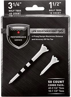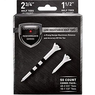 Maximize distance and accuracy on every tee shot with Maxfli® Performance Series Low Resistance Golf Tees. This combo pack features tees designed for use with metal woods and irons for targeted performance. The 4-prong design reduces club face contact and golf ball drag for maximized distance and accuracy from the tee. Optimal Launch System cues along the tee shaft to help golfers achieve consistent height and trajectory.