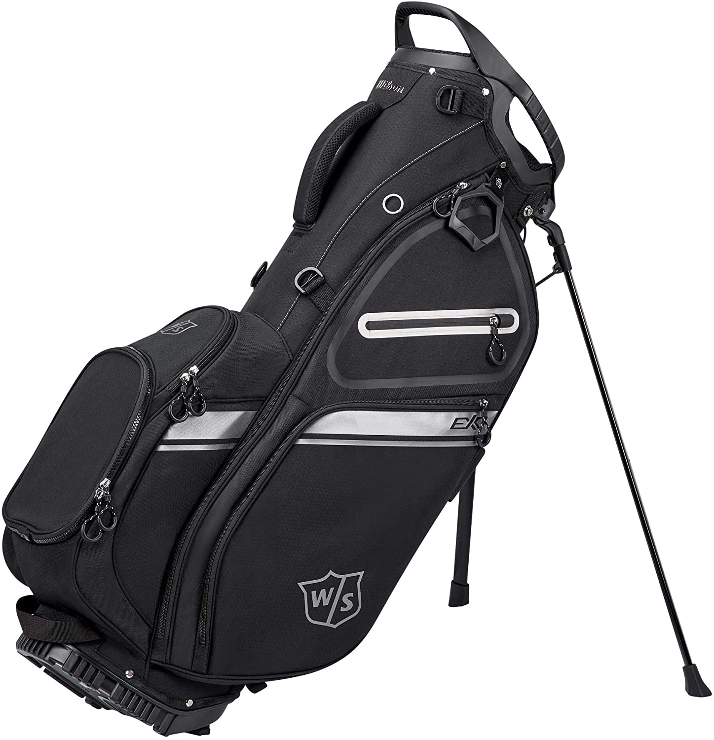 - STAY ORGANIZED WITH THE WILSON STAFF EXO 11 CARRY BAG9.5″× 8″ 5-way top with 3 molded handles – 2 Full-length dividers – 1 Full-length garment pocket – 1 DryTech valuable pocket – 1 Large ball pocket – 3 Accessories pockets – 1 Large open pocket for a rangefinder or drink